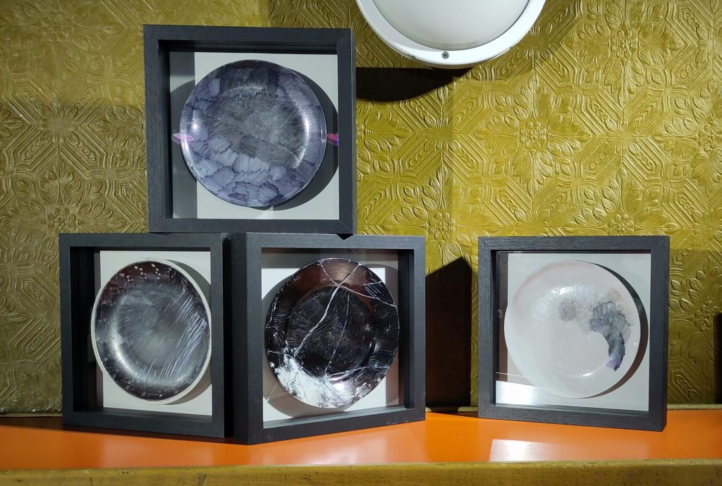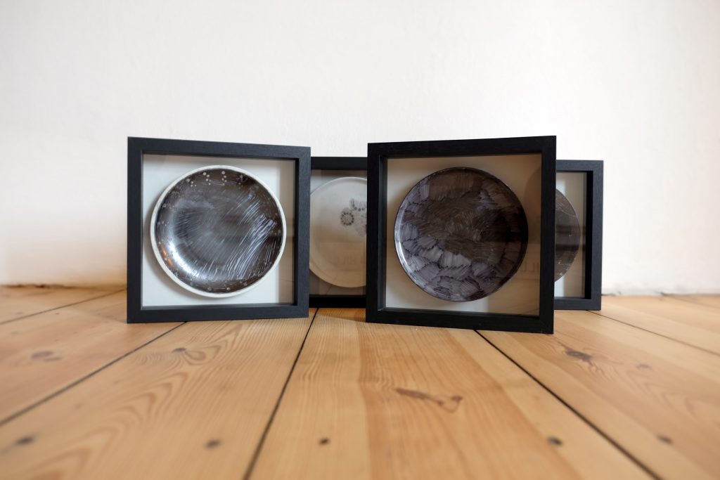 In einer Depression erleben Betroffene manchmal einen Schlüsselmoment, der ihnen deutlich zeigt, wo sie stehen. Eine gewohnte und normalerweise leicht von der Hand gehende Alltagssituation ist plötzlich unüberwindbar schwer und düster. Frühstücksteller stehen hier für vertraute, unbeteiligte Alltagsbegleiter – schwarz überzeichnet, zerbrochen, geklebt – denn Depression mischt sich in jeden Bereich des Alltags ein.
